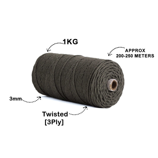 3mm Twisted (3Ply) | Dark Grey | 200 - 250 Metres | 1kg Spool | Cotton | No 02