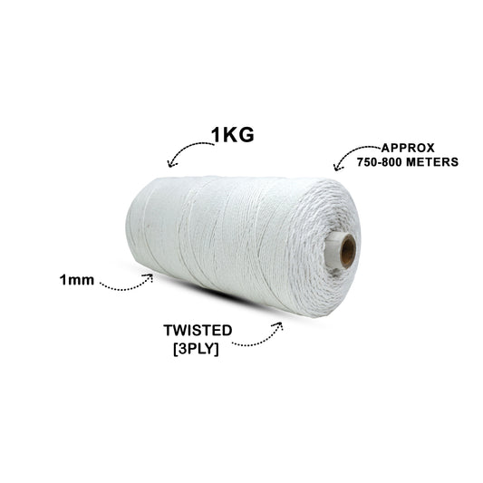 1mm Twisted (3Ply) | Pure White | 750 Metres | 1kg Spool | Cotton | No 03