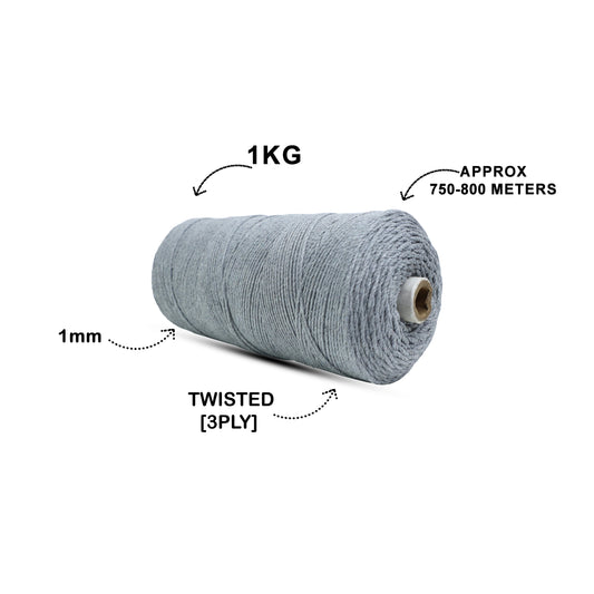 3mm Twisted (3Ply) | Steel Grey | 200 - 250 Metres | 1kg Spool | Cotton | No 24