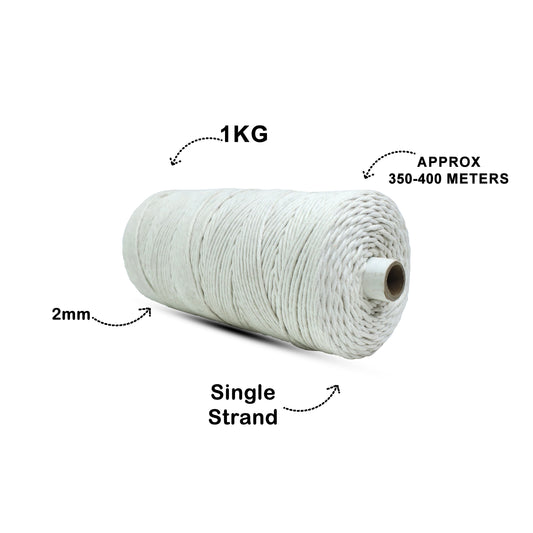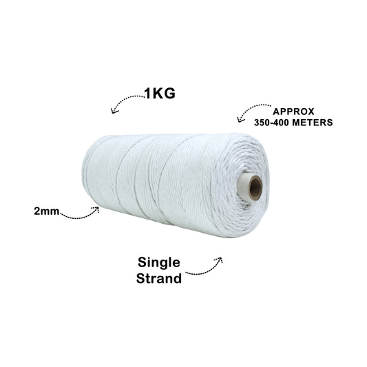 2mm Single Strand | Pure White | 350 - 400 Metres | 1kg Spool | Cotton | No 03