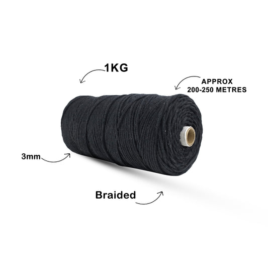 3mm Braided | Black | 200-250 Metres | 1 Kg Spool | Cotton | No 01