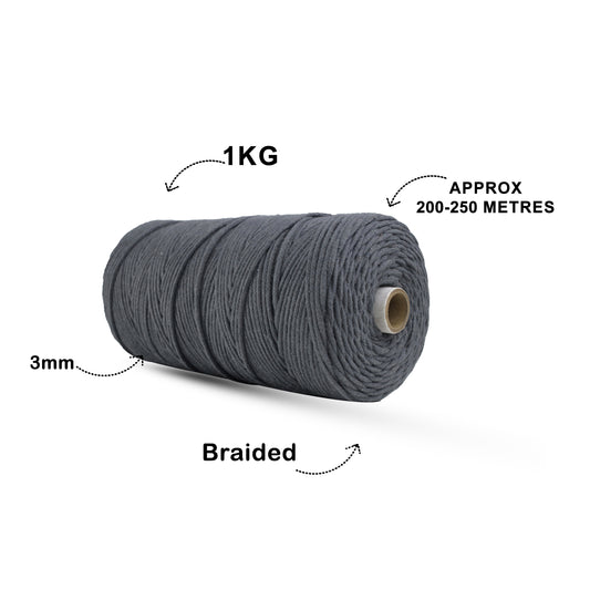 3mm Braided | Dark Grey | 200-250 Metres | 1Kg Spool | Cotton | No 02