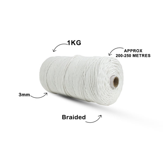 3mm Braided | Pure White | 200-250 Meters | 1Kg Spool | Cotton | No 03