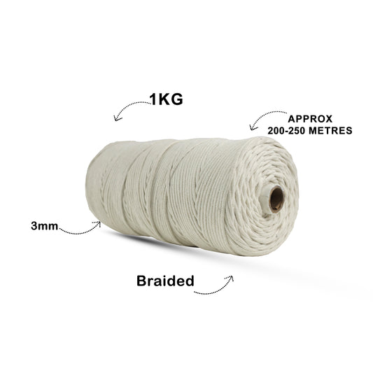 3mm Braided | Off White | 200-250 Meters | 1 Kg Spool | Cotton | No 04