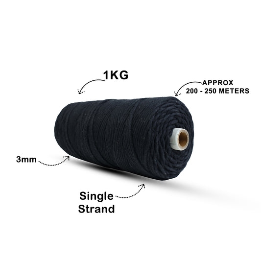 3mm Single Strand | Black | 200 - 250 Metres | 1kg Spool | Cotton | No 01