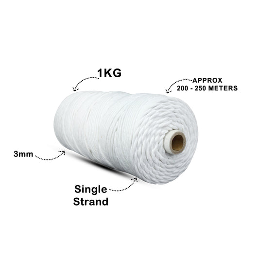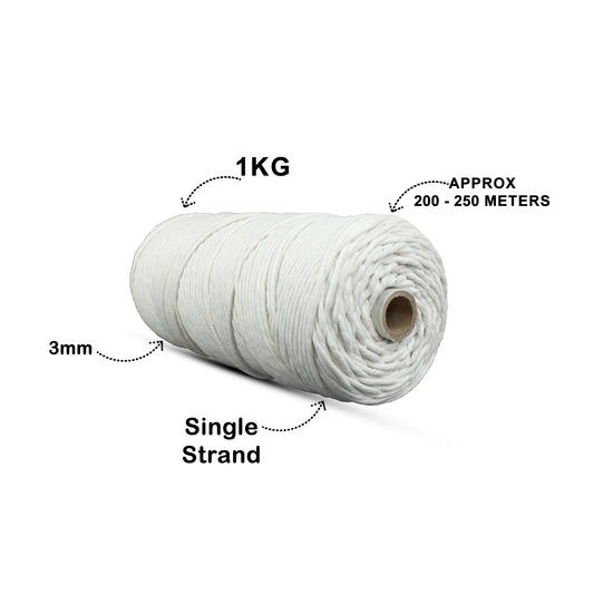 3mm Single Strand | Pure White | 200 - 250 Metres | 1kg Spool | Cotton | No 03