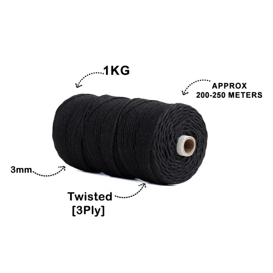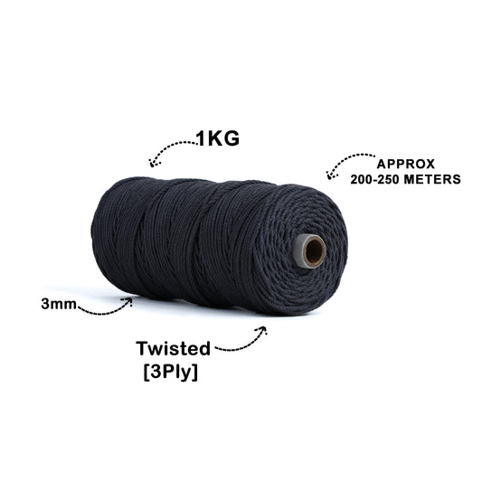 3mm Twisted (3Ply) | Black | 200 - 250 Metres | 1kg Spool | Cotton | No 01