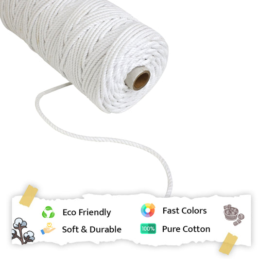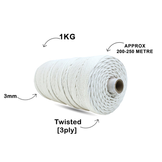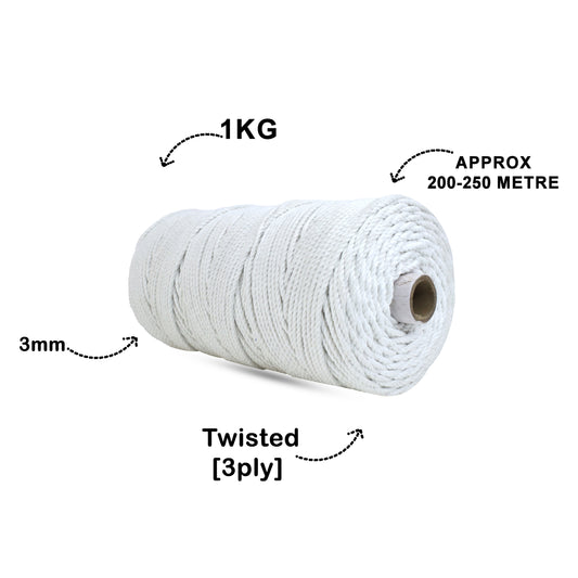 3mm Twisted (3Ply) | Pure White | 200 - 250 Metres | 1kg Spool | Cotton | No 03