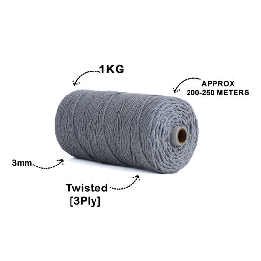 3mm Twisted (3Ply) | Dark Grey | 200 - 250 Metres | 1kg Spool | Cotton | No 02