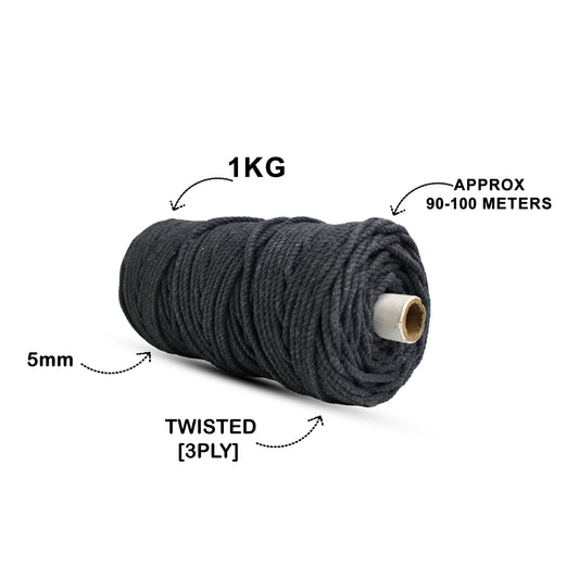 5mm Twisted (3Ply) | Black | Approx 100 Metres | 1kg Spool | Cotton | No 01