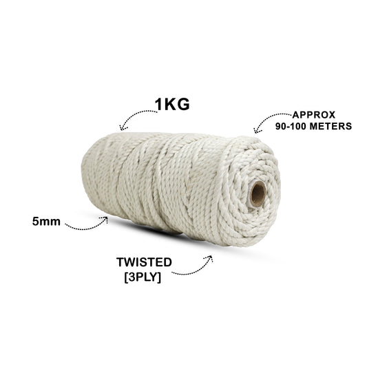 5mm Twisted (3Ply) | Pure White | Approx 100 Metres | 1kg Spool | Cotton | No 03