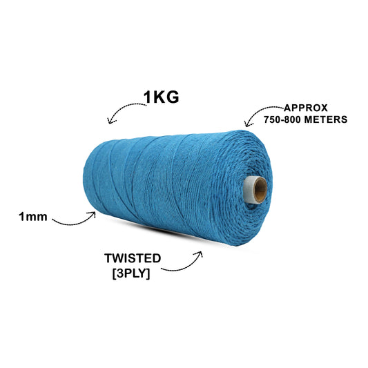 1mm Twisted (3Ply) | Bright Blue | 750 Metres | 1kg Spool | Cotton | No 22