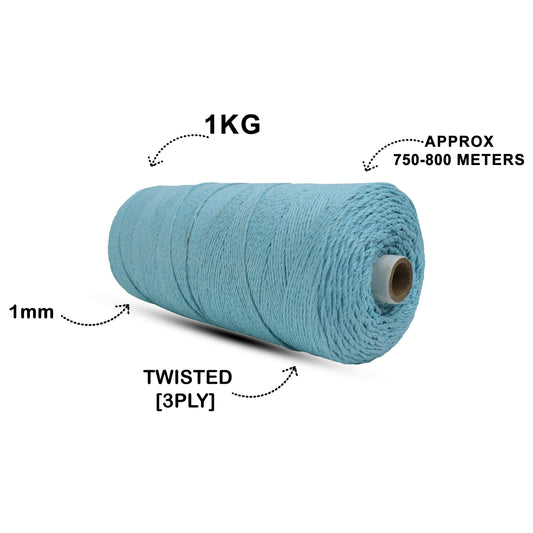 1mm Twisted (3Ply) | Mint Blue | 750 Metres | 1kg Spool | Cotton | No 25