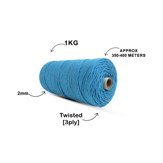 2mm Twisted (3Ply) | Bright Blue | 350 - 400 Metres | 1kg Spool | Cotton | No 22