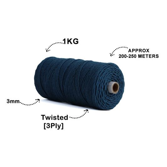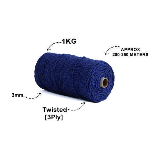3mm Twisted (3Ply) | Dark Blue | 200 - 250 Metres | 1kg Spool | Cotton | No 27