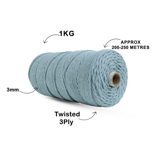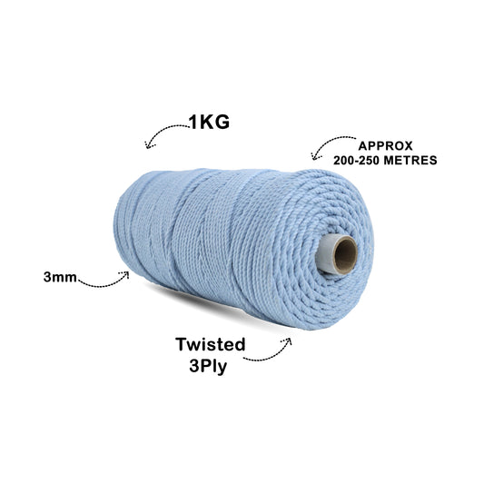 3mm Twisted (3Ply) | Ice Blue | 200 - 250 Metres | 1kg Spool | Cotton | No 32