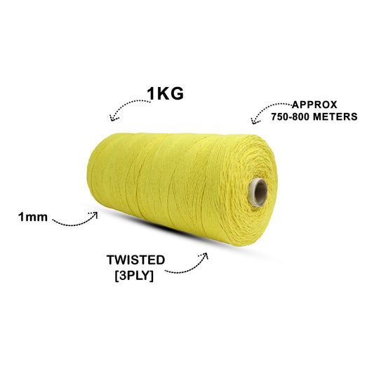 1mm Twisted (3Ply) | Yellow | 750 Metres | 1kg Spool | Cotton | No 08